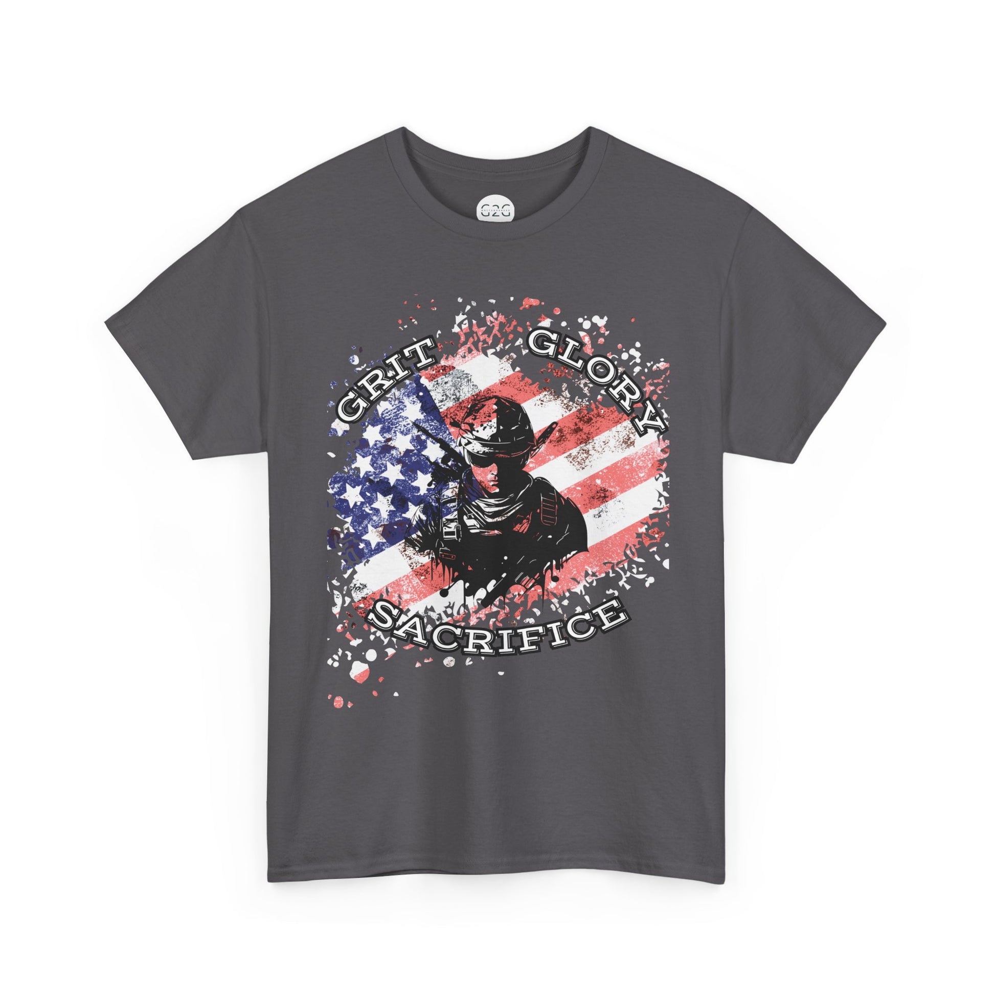 Honor. Strength. Unshakable resolve. The Grit. Glory. Sacrifice. Military T-Shirt is a tribute to those who serve with heart and never quit. Featuring a bold design that pairs perfectly with a soldier's silhouette and a faded American flag, this tee captures the soul of the warrior—past and present. Made for patriots, veterans, and anyone who carries the weight of freedom with pride, this shirt is more than apparel—it's a statement. Wear your grit.